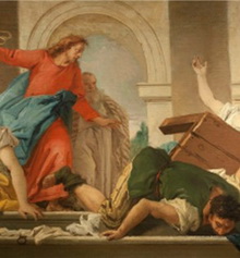 Našel je /Jezus/ v templju prodajalce volov, ovc in golobov ter menjalce, ki so tam sedeli. Naredil je iz vrvi bič in vse izgnal iz templja, ovce in vole; menjalcem je raztresel denar in prevrnil mize, prodajalcem golobov pa je rekel: »Spravite to proč, iz hiše mojega Očeta ne delajte tržnice!« In spomnili so se njegovi učenci, da je pzisano: »Gorečnost za tvojo hišo me razjeda.« (Jn 2,14–17)