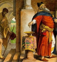 »Dva človeka sta šla v tempelj molit: eden je bil farizej, drugi cestninar. Farizej se je postavil in pri sebi molil takóle: ›Bog, zahvaljujem se ti, da nisem kakor drugi ljudje: grabežljivci, krivičniki, prešuštniki ali tudi kakor ta cestninar. Postim se dvakrat na teden in desetino dajem od vsega, kar dobim.‹ Cestninar pa je stal daleč proč in še oči ni hôtel dvigniti proti nebu, ampak se je tolkel po prsih in govóril: ›Bog, bodi milostljiv meni grešniku!‹ Povem vam, ta je šel opravičen domov, oni pa ne; kajti vsak, kdor se povišuje, bo ponižan, in kdor se ponižuje, bo povišan.« (Lk 18,10–14)